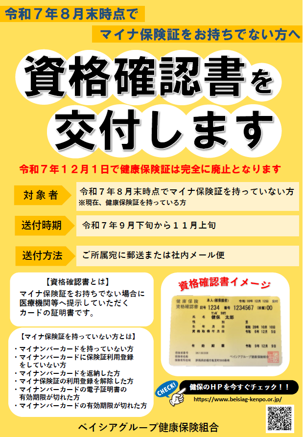 この度、令和7年12月1日をもって、健康保険証が完全に廃止となることから、健康保険証を持っていて、マイナ保険証を持っていない方を対象に、資格確認書の一斉交付を行います。